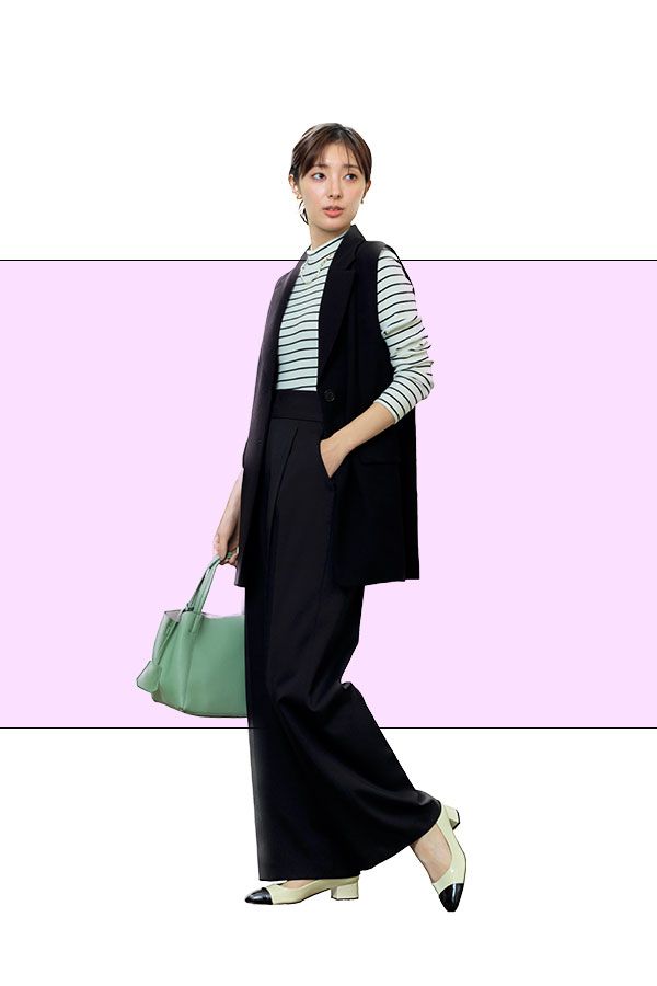 カットソー¥1,500/UNIQLO ジレ¥28,600/アンタイトル ワイドパンツ¥23,100/アルページュストーリー バッグ¥6,930/カシュカシュ(アンビリオン) ネックレス¥17,600/ココシュニック オンキッチュ(ココシュニック) イヤリング¥25,300/Grosse(グロッセ・ジャパン) シューズ¥9,500/CHARLES & KEITH