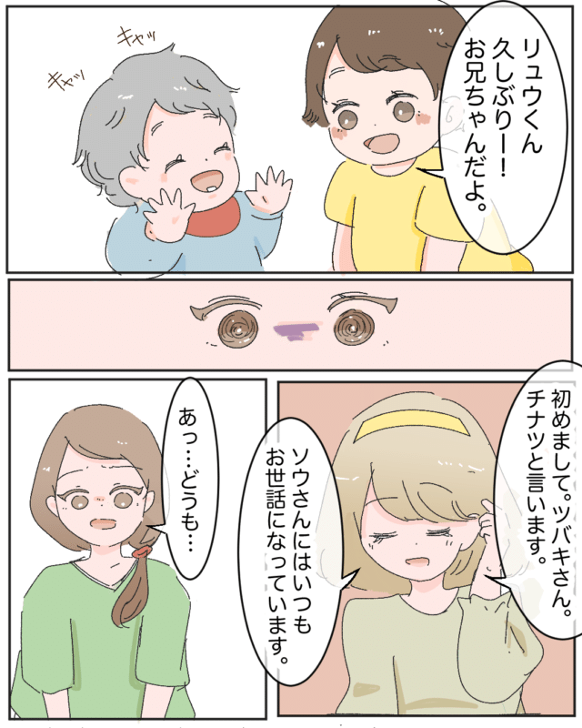 「初めまして。ツバキさん。チナツと言います。ソウさんにはいつもお世話になっています。」チナツが挨拶をした時ツバキさんの様子がおかしい。