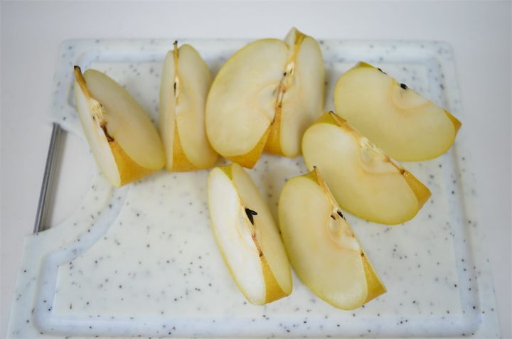 1.梨は8等分にして皮を剥いて芯を取り除き、それぞれ4等分にする。