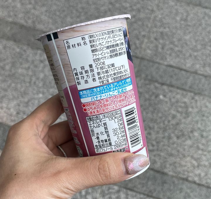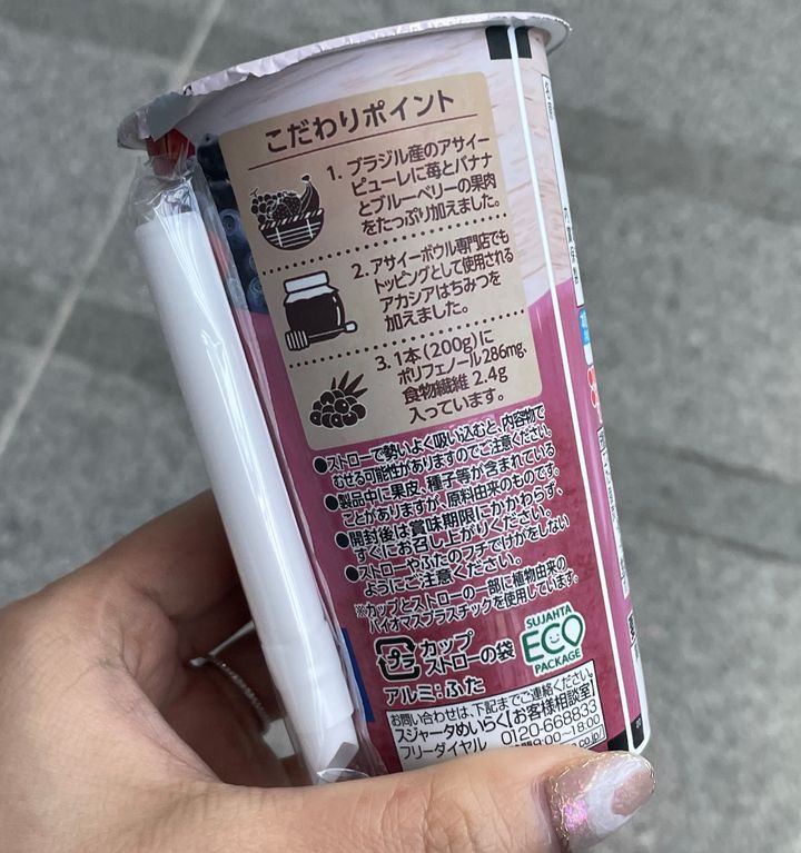 この商品はアサイーピューレ、バナナ・ぶどう・りんごの果汁をミックスし乳製品を合わせているそうです。