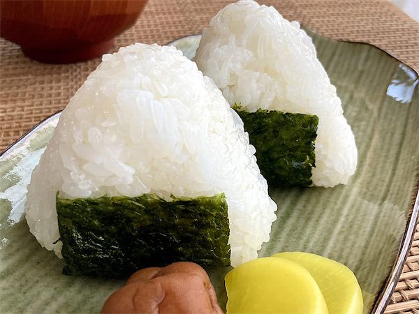 こちらのお米でおにぎりを作ってみます。軽くお茶碗一杯分を取り、手のひらで10回くらい力を入れずに軽く握りました。具なしの塩おにぎりにのりを巻きました。