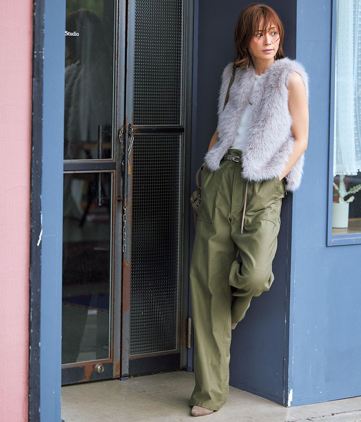 パンツ¥28,600※サイズ5(ハイク/ボウルズ)ジレ¥24,200(アルページュストーリー/アルページュストーリー プレスルーム)Tシャツ¥6,990(ネイヴ/ネイヴ〈オンワード樫山〉)ベルト¥28,600(プントヴィータ/ウィム ガゼット 青山店)バッグ¥174,900(ミチノ・パリ/アマン)靴¥104,500(ペリーコ/アマン)ピアス¥17,600バングル¥29,700(ともにアダワットトゥアレグ)ネックレス¥71,500(エリッカ ニコラス ビゲイ/RHC ロンハーマン)
