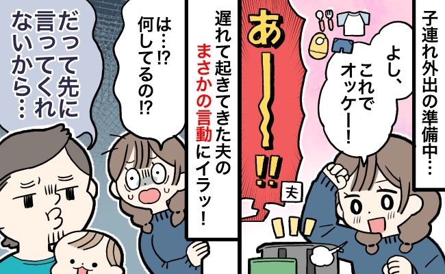 お出かけの日に、子どもたちより起きるのが遅かった夫。夫が自主的に子どものお世話を始めたのはいいのですが、「見てからやって!」とイラッとする出来事が……。