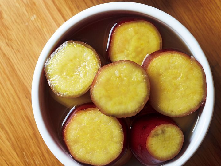 (2)さつまいもを鍋に戻し、水1と1/2カップと、はちみつを加えて弱火にし、さつまいもが柔らかくなるまでふたをして5~7分煮る。火を止め、煮汁につけたまま味を含ませ、清潔な保存容器に移す。