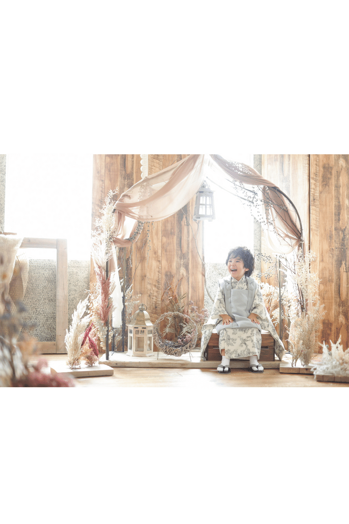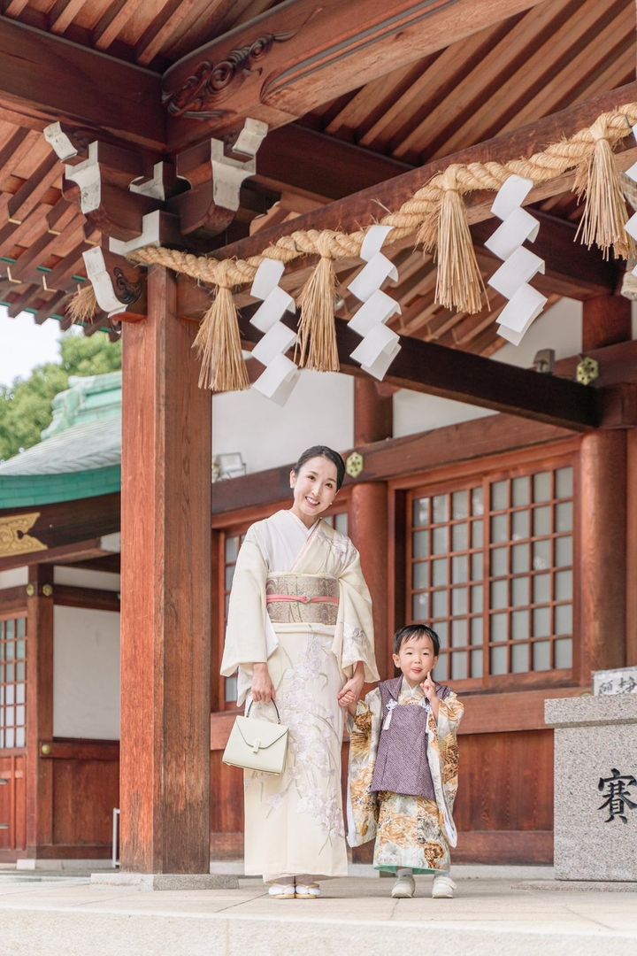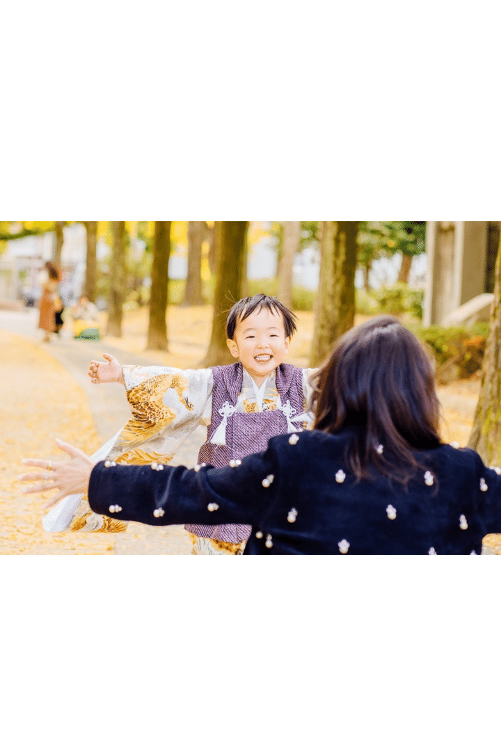 「一番の理由はやはり3歳しか着られない被布姿を写真に残したかったということです。下駄を嫌がってスニーカーに変えてしまったり、途中で疲れて眠ってしまったりと、5歳のときにはないかもしれない写真が残せたのでやってよかったです。着物は人と被るのが嫌だったのでアンティーク小物をリメイクしている作家さんからフリマアプリ経由で購入。被布は着付けも難しくなく、ヘアセットは少しワックスを付けるくらいで済むので支度は私でも簡単。5歳は羽織袴を着せたいなと思っています」山上里菜さん・35歳/歯科衛生士(4歳の男の子ママ)