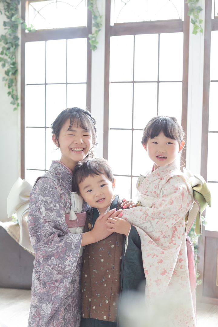 「姉二人と同様に、長男も二回やってあげたいなとお詣りせず写真のみの七五三に。5歳は袴の予定なので、3歳は今しか着られない被布をチョイス。長女がちょうどハーフ成人式なので、せっかくならばと姉二人も着物で撮影することにしました。衣装も借りられるスタジオだったのでヘアメイクから着付けまですべてやってもらえて、三人いてもバタバタせずに済みました。 最初、息子が私から離れず撮影が進まなかったので、お気に入りのおもちゃやお菓子を持っていってもよかったかな、と後から思いました。姉弟が一緒だと慣れるのが早かったので、家族写真や姉弟撮影もする予定があるならそちらを先にしたほうがスムーズにいく気がします」日比祐歌さん・36歳/主婦(11歳と6歳の女の子と3歳の男の子ママ)