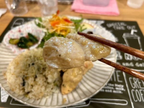お肉はバジルと塩レモンで味付けしているそうです。レモンのサッパリとした味付けが印象的でした。