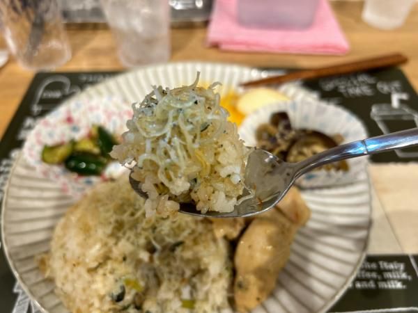 白子(シラス)と小松菜のチャーハンには、口に残らない程度にニンニクの香りがついていて食欲が出てくる味付け!