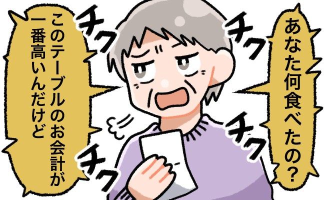 例えば、夫と私、義祖母、義父(義祖母の息子)、食べ盛りの孫たち数名で食事に行ったときのこと。誰が見ても私が一番食べていなかったのですが「このテーブルの値段が一番高かったけど、あなた一体なに食べたの?!」と言われました。