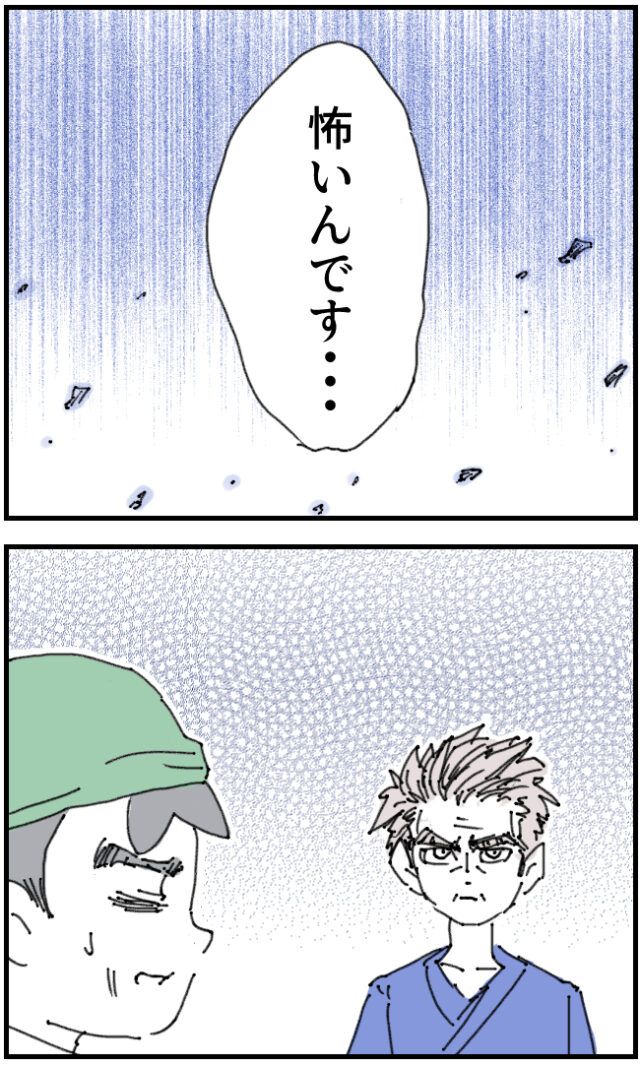 「怖いんです」いちろうさんは、直接かおりさんと話し合えばよいと分かっているものの、そうするのが怖いとお義父さんに打ち明けました。