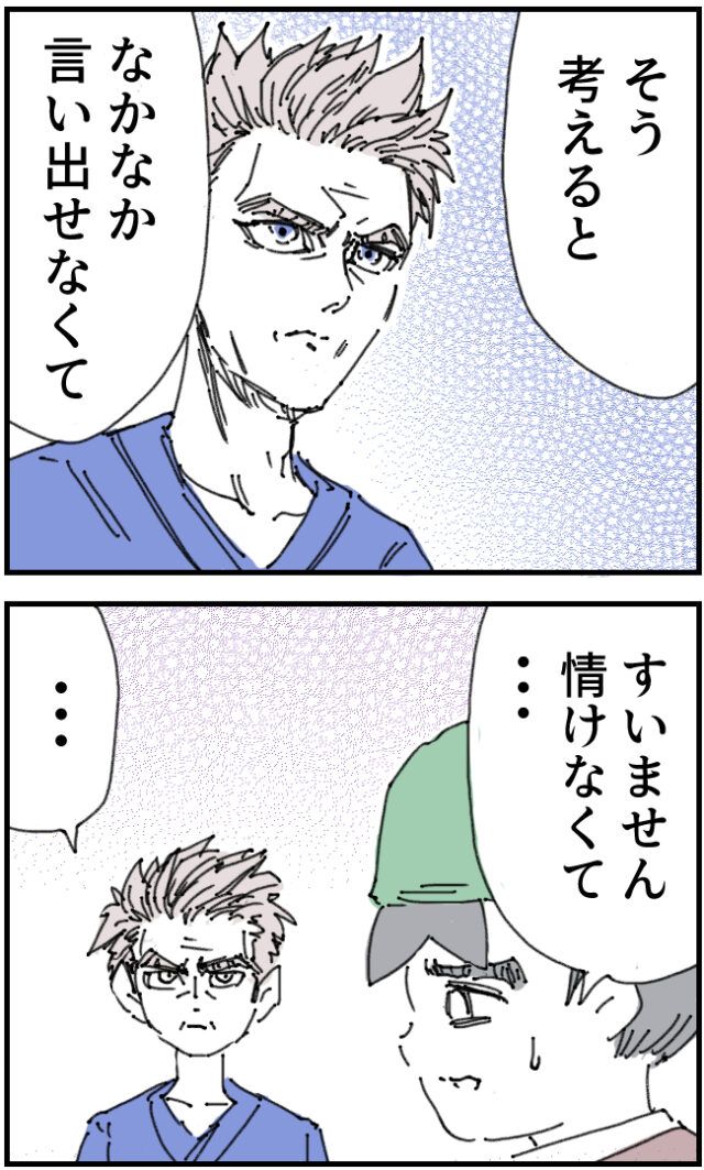 「だから、ここで働いてる事とか、僕の想いとか、ちゃんと伝えなきゃって思ったんですけど・・・もしまたかおりを怒らせてしまったら、今度こそお終いかもしれない」いちろうさんは、自分の想いを伝えることでかおりさんを怒らせ関係が終わってしまうかもしれないことを恐れていました。