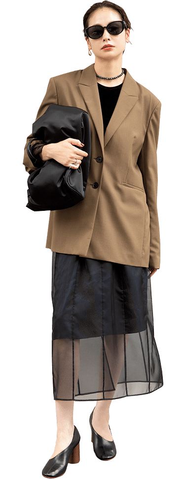 「女性らしいスタイルが気になっているので、シアーなスカートを合わせてエレガントにまとめました。久しぶりにブラウン系のカラーも着たくて、このカラーをチョイス。小物使いでモード感も意識しました」