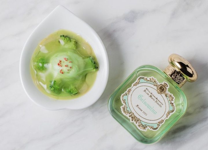 セイボリーは「ジャルディーニ メディチェイ - メディチ家の庭園 - 」というフレグランスコレクションから着想を得た5品で構成。パリミシュランレストラン「ル ジュール ヴェルヌ」で経験を積んだシェフ久世健介氏が担当した。「ブロッコリーのフランとベルガモットクーリ リコッタチーズとキュウリのジュレ ピンクペッパー」は、「オードパルファム ジェルソミーノ」の香りを参考に、メディチ家の温室に咲くジャスミンをイメージしたもの。「牛頬肉赤ワイン煮込みのプレッセとティムットペッパークリーム ブレッドサブレ 大根と紫キャベツのジュレ」は、「オードパルファム アイリス」の香り、フィレンツェの紋章であるアイリスの花を表現している。