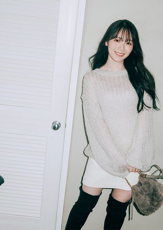 ニット¥13,600/LILY BROWN(LILY BROWNルミネエスト新宿店) スカート¥10,450/ココディール バッグ¥13,200/ノエラ ニーハイブーツ¥17,600/スティーブマデン(ダニュウ)