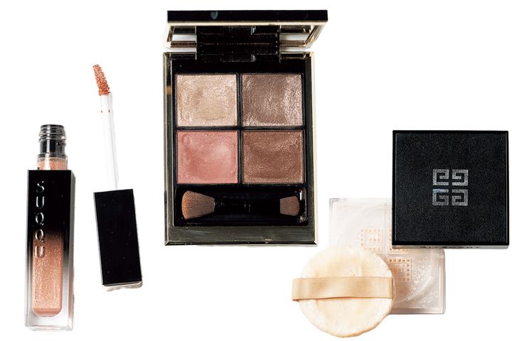 肌の内側から自然に発光するようなツヤが出るジバンシイのプリズム・リーブル002は過去イチ好きなパウダー。SUQQUのアイシャドウ01は捨て色なし!同ブランドのリキッドアイシャドウ06を瞼の中央にふんわり乗せて、ツヤやかで印象的な目元を作ります。