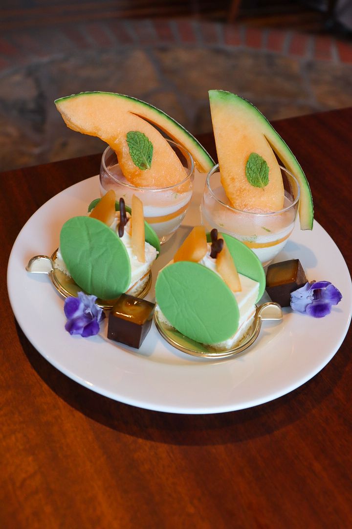 スタンド: ノンアルコールスパークリングワインを注いだメロンのパンナコッタ仕立て / メロンのショートケーキ / ヴィーガン プティフール