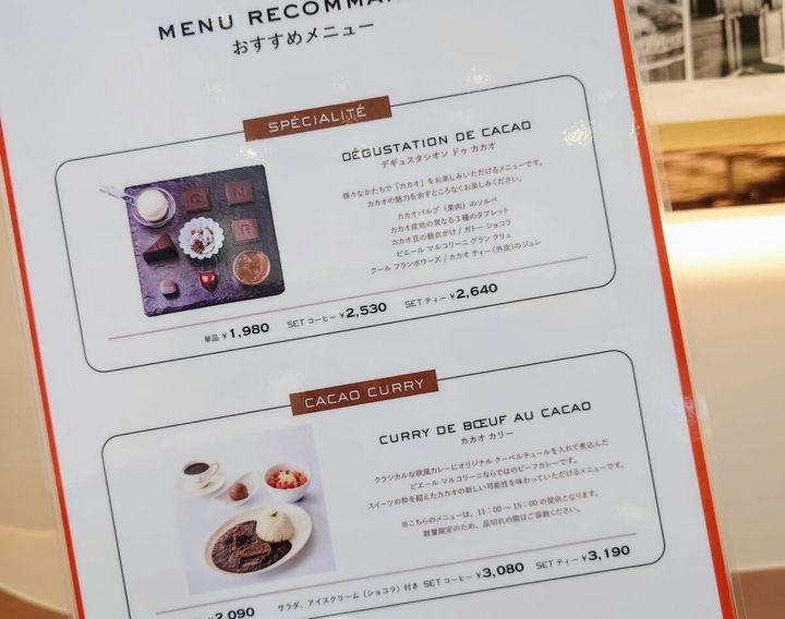カカオパルプ(果肉)のソルベ、カカオ産地が異なる3種のタブレット、ガトーショコラ、カカオティー(外皮)のジュレなど、カカオを余すことなく味わい尽くせるセット「デギュスタシオン ドゥ カカオ」(税込1,980円)。欧風カレーにクーベルチュールを入れて煮込んだ「カカオ カリ―(サラダ付き)」(税込2,090円)の軽食もおすすめ。