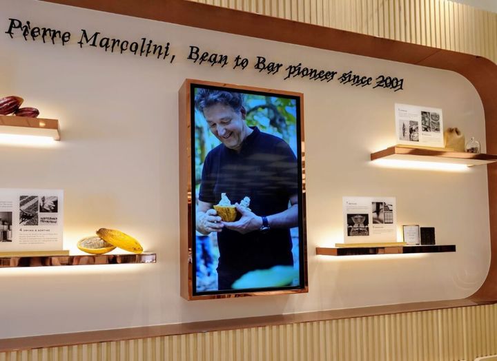 チョコレートのおいしさはさることながら、パティシエのピエールマルコリーニさんのにこやかな笑顔もブランドの魅力のひとつ。2024年10月には九州初出店となるカフェ併設直営店を福岡・天神にオープンし、現在国内に13店舗を展開しています。