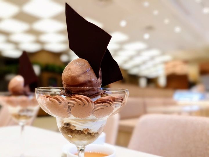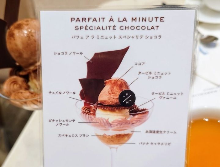 チョコレート好きは見逃せないパフェ「パフェ ア ラ ミニュット スペシャリテ ショコラ」(税込1,980円)。2024年10月現在、関東圏ではコレド室町テラス店でしか味わえないパフェです。