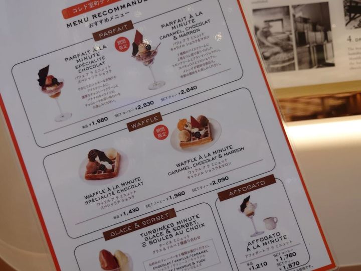 ショコラとヴァニーユのアイスクリームをのせた「ワッフル ア ラ ミニュット スペシャリテ ショコラ」(税込1,430円)、スペキュロスとヴァニーユのアイスクリームにエスプレッソを注ぐデザート「アフォガード ア ラ ミニュット」(税込1,210円)など、ほかのメニューも気になるところ。