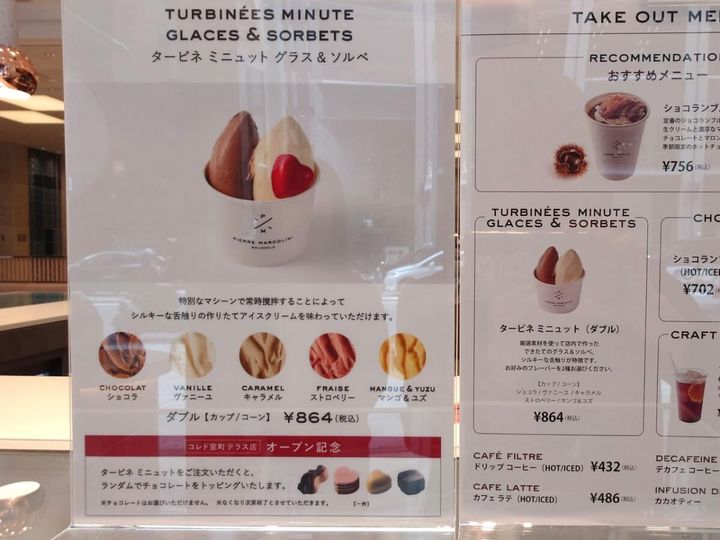 フレーバーは「ショコラ・マンゴ&ユズ・ヴァニーユ(バニラ)・ストロベリー・キャラメル」の5種類。コレド室町テラス店限定のタービネ ミニュット(ダブル)は、好きな2種を選ぶスタイルです。
