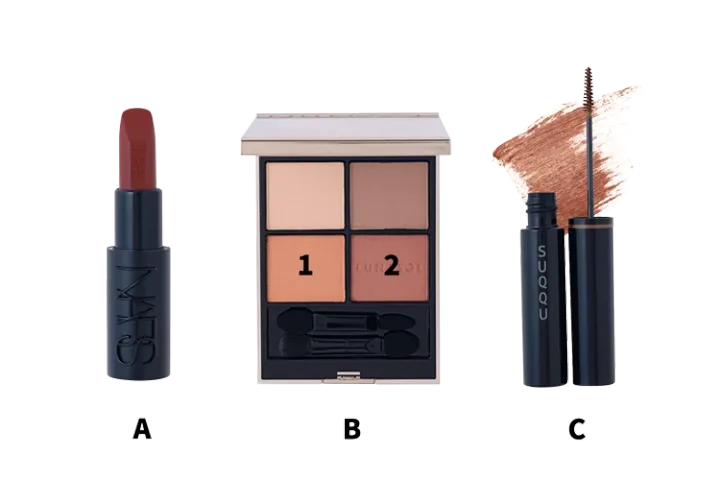 B-1を上下まぶたに広範囲につけたら、B-2を下まぶたの中央メインに細めに重ねる。眉のトーンも全体にあわせてCでカラーリング。
