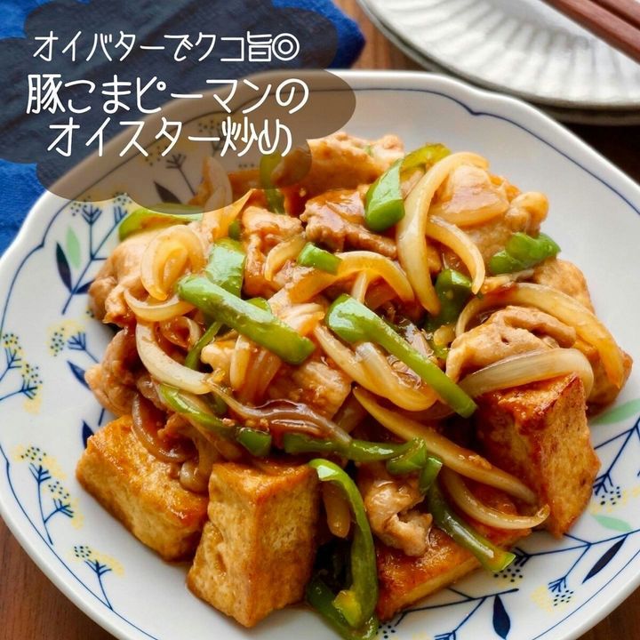 オイスターソースとバターのコクがたまらない、豚こまとピーマンのオイスター炒め。厚揚げを加えることでボリュームもアップし、食べ応えばっちりに仕上がります。