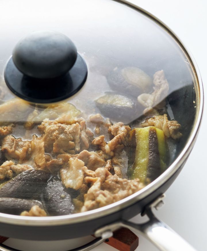 (2)豚肉をかるく炒めてからなすとともに煮る