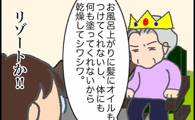 私にとって、義母がデイケアで過ごしていた時間は夢のような時間でした。……が、義母にとっては嫌な時間だったようで、帰って来てから文句ばかり言っています。そもそも、お風呂に入りたくてデイケアに行ったはずが、大勢入るから不衛生に思えてお風呂を断ったと聞いてビックリ。さらに、ヘアオイルを塗ってもらえなかっただの、体にも何も塗ってくれなかっただの、デイケアをリゾートホテルとでも思っているような発言も。