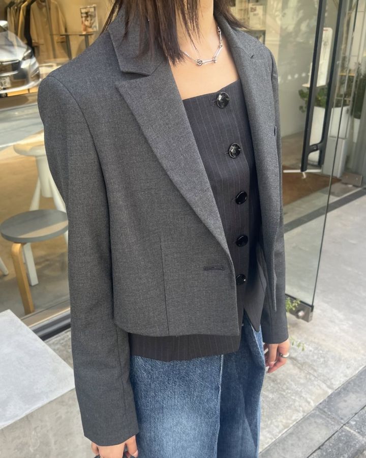 「ジャケットをメインに、デニム合わせでカジュアルMIXにコーディネートしました。デニムの形は太いだけじゃなくとてもキレイなので、ハズしすぎていないところもポイント! 普段は、カジュアルな服が多くカチッとしすぎるのが苦手なので、ジャケットにはよくデニムを合わせてスタイリングします」