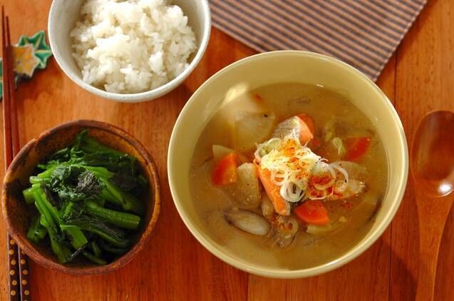 うまみとコクを与える酒粕で作るスープは、免疫が下がりがちな季節の変わり目に食べておきたい料理です。身体がポカポカに温まりますよ。また、副菜のツルムラサキは鉄分、ベータカロテン、ビタミンCがとっても豊富。酒粕はシチューなどの洋食にも使えるので常備すると便利な発酵食品です。