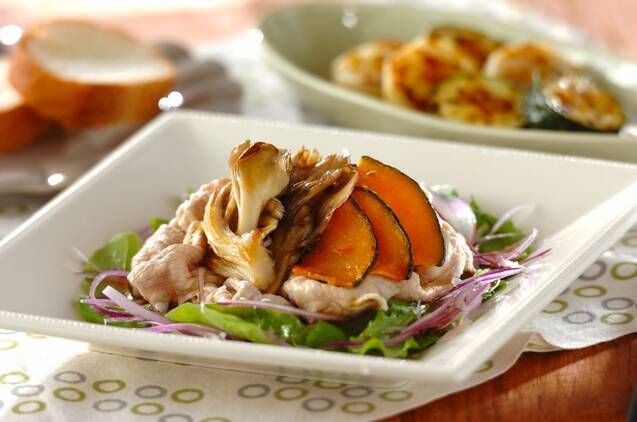 ビタミン豊富で脂身が少なくヘルシーなヒレ肉。食べ応えがあってメインになるサラダです。マイタケ、ルッコラなど旬の食材に、ユズが香るドレッシングで秋らしさを演出。食感が楽しい長芋とズッキーニのカレーソテーと相性ぴったりなダイエット献立です。