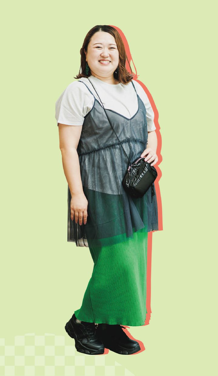 「このスニーカーが履きたかった! スカートに合わせてピアスもグリーンで統一しました! アイテム選びでは、お腹と腰周りがカバーできるものを選ぶようにしています。」