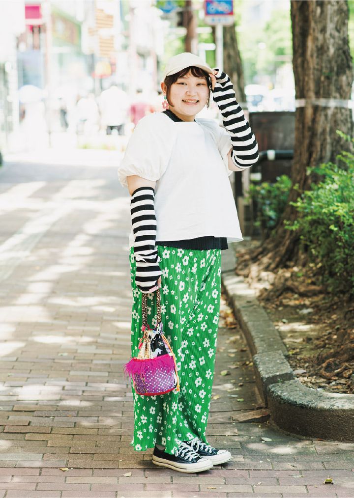 「古着屋で購入したグリーンのフラワー柄パンツが主役のPOPなコーディネート! Y2K風味のアームウォーマーと、カラフルなパッチワークの巾着バッグもおしゃれなアクセントに。」