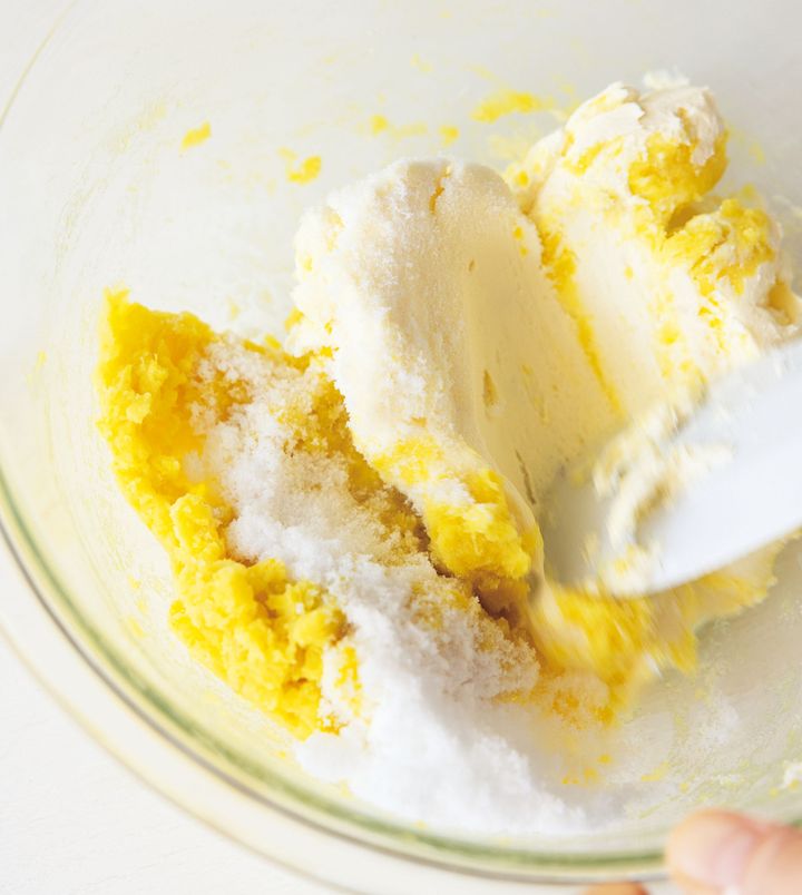 残りのさつまいもペーストにクリームチーズと砂糖を入れ、ゴムべらで混ぜる。卵を1個ずつ割り入れ、そのつど泡立て器で混ぜる。牛乳を少しずつ加えながら混ぜる。