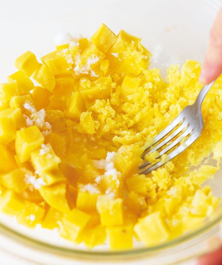 (2)再びざるに上げてしっかりと水けをきる。ボールをさっと洗って戻し入れ、〈A〉を加えて温かいうちにフォーク(あればマッシャー)で粒がなくなるまでつぶす。ここでしっかりとつぶすことで口当たりがなめらかに。