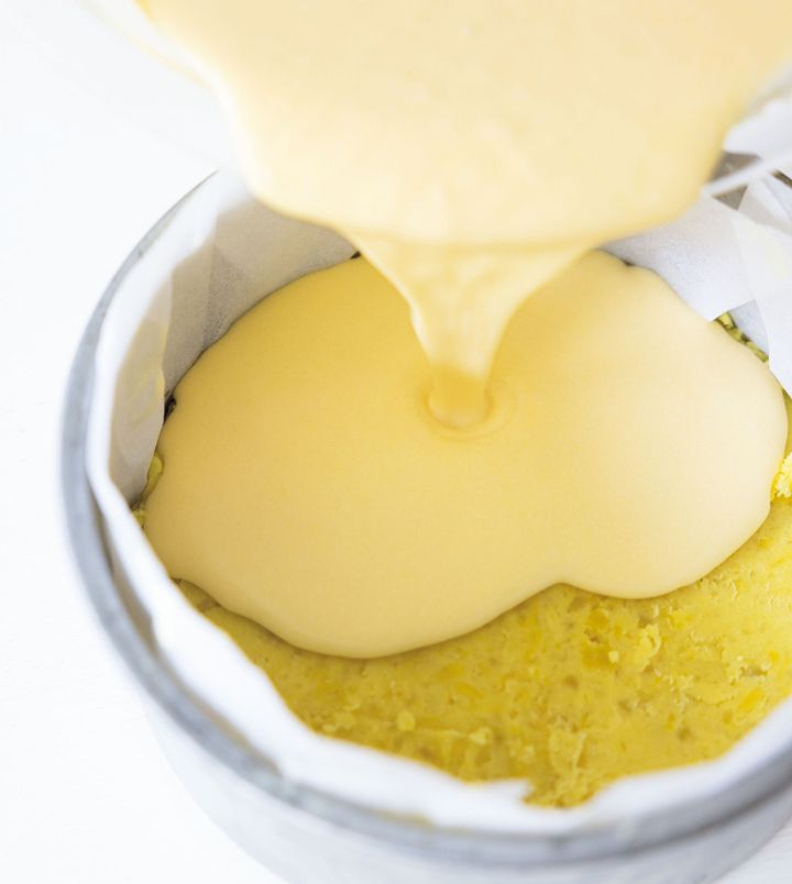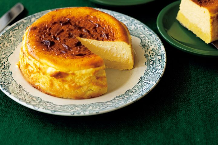 型に生地を流し入れ、台にかるく打ちつけて表面をならす。天板にのせてオーブンの下段に入れ、200℃で25~35分、表面がこんがりとするまで焼く。ケーキクーラーなどにのせ、粗熱が取れたら、冷蔵庫で6時間以上(できれば一晩)置く。温かいうちに食べる場合は、粗熱が取れたら型からはずし、切り分ける。