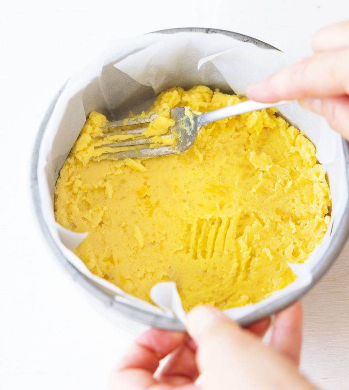 上記「さつまいもペースト」200gを取り分け、型の底一面に敷きつめる。平らになるようフォークの背で表面をならす。