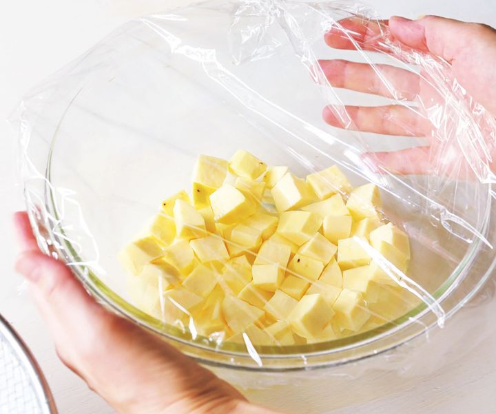 (1)さつまいもは幅1cmの輪切りにして皮を厚めにむき、1cm角に切る。たっぷりの水に2~3分さらしてざるに上げ、水けをきる。口径18cmの耐熱のボールにさつまいもと水150mlを入れ、ふんわりとラップをかけて、電子レンジ(600W)で7~8分、竹串がすっと通るまで加熱する。