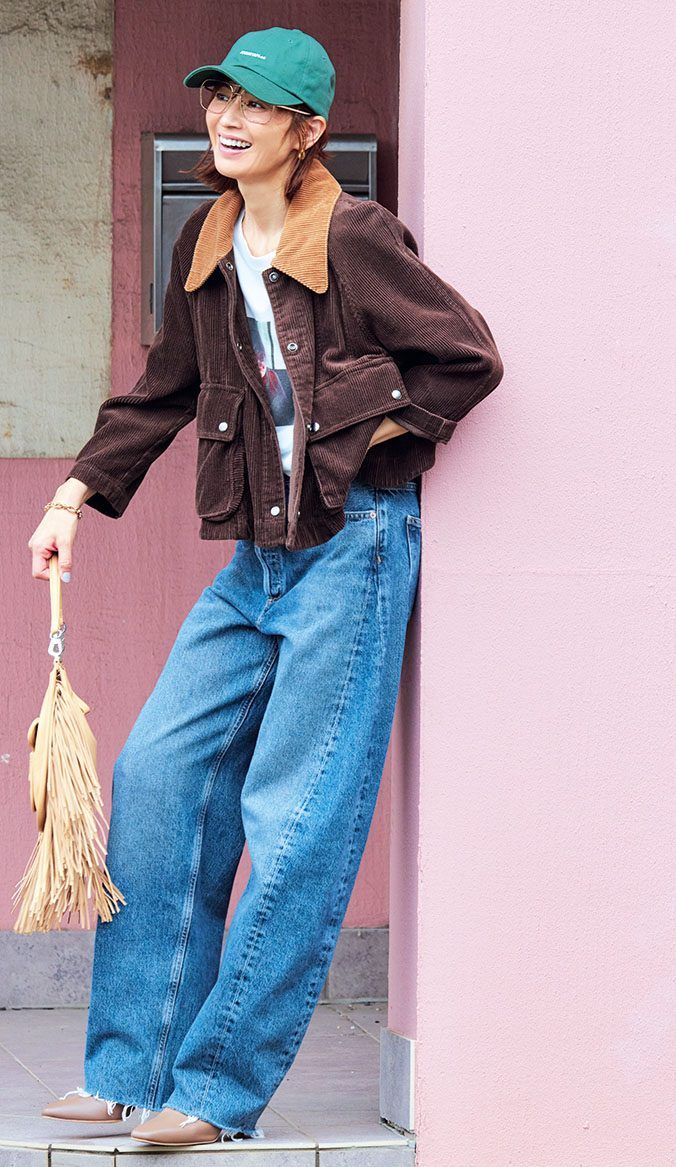 デニムもワイドめ一択ですよね。キャップなどの小物使いで視線を上にあげればバランスも取りやすいです。