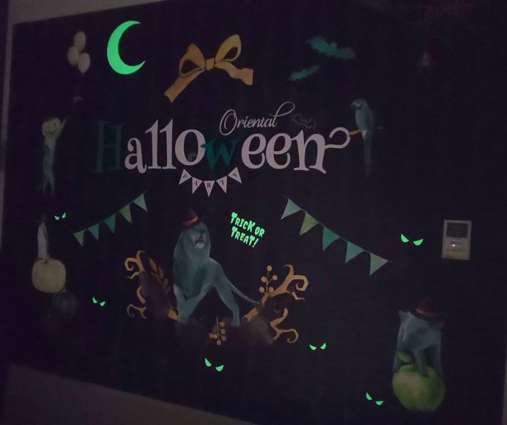 実はベッド横の壁にはユニークな仕掛けが。室内灯が付いているときは、「Halloween」という文字と共にライオンなどの絵が見えるのですが、電気を消して真っ暗にすると、文字が浮かび上がるんです。