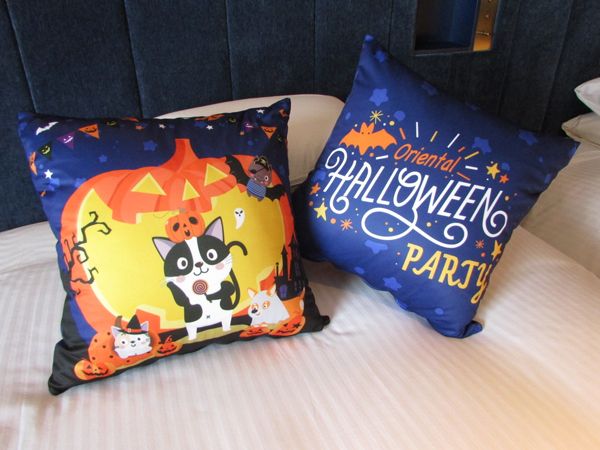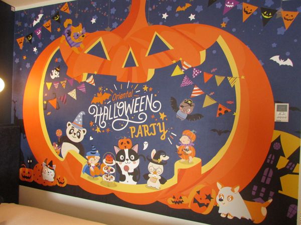 先ほどの「オリエンタル・コンフォート」とはうって変わって、オレンジのジャックオーランタンなどがモチーフになった、ポップな客室です。