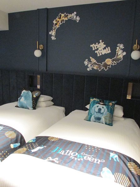 ブルーを基調にした、“大人ハロウィン”な雰囲気が特徴の客室。ベットカバーやクッションもシックで、女子旅など、大人同士でのステイにぴったりです。