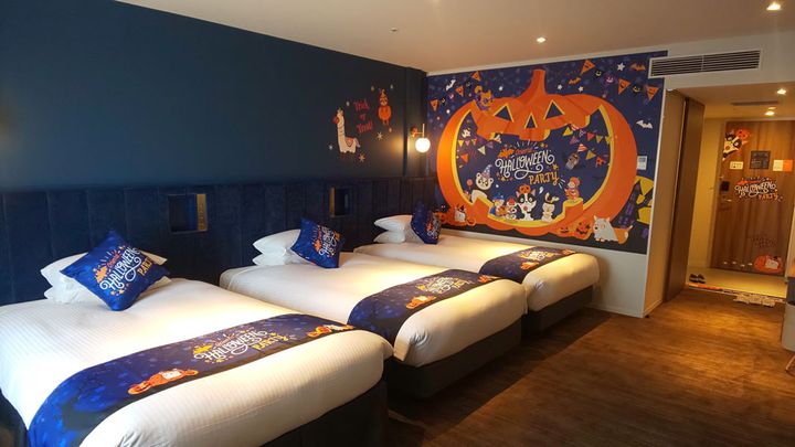 42㎡の客室にはベッドが3つあり、広々とした空間。こちらも入口や洗面所もハロウィーンのデザインになっています。