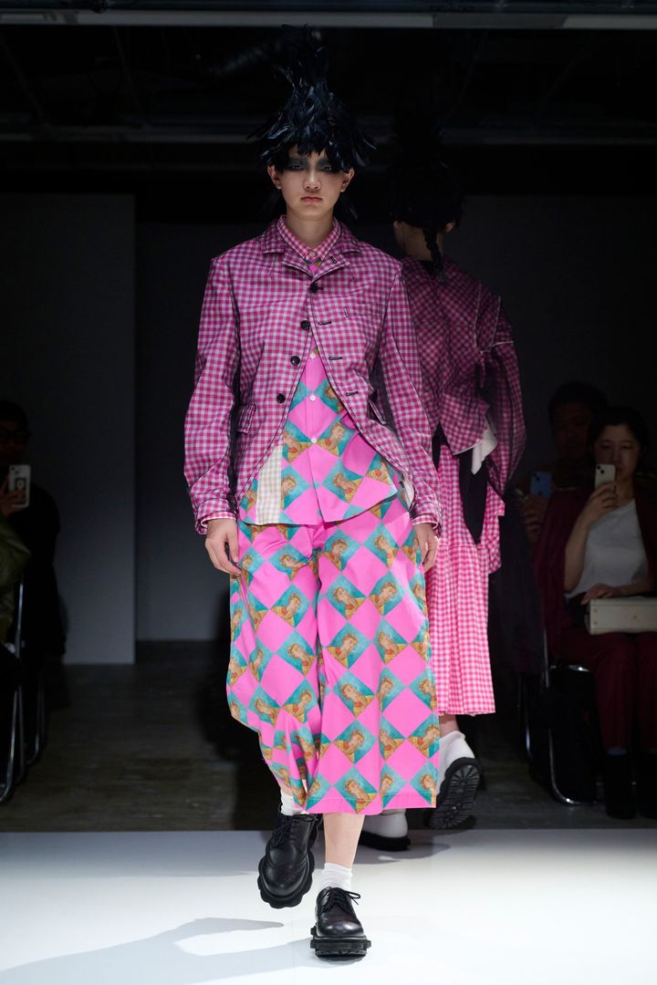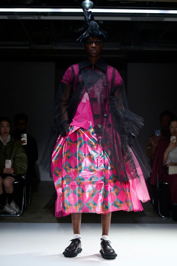 ファーストルックはピンクのフリル付きシャツと肖像画がプリントされたスカート。透ける素材の黒のトレンチコートを羽織っていた。