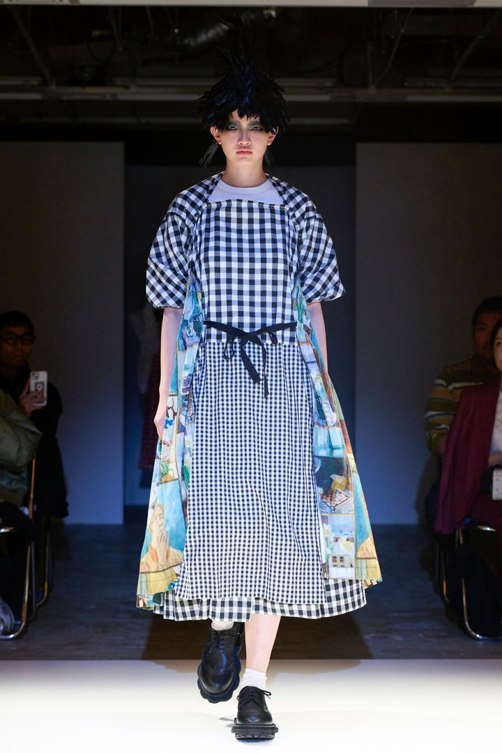 大半のモデルたちは黒いフェザーのヘッドピースとアイメイクでダークなムードを醸している。そしてギンガムチェックやドットといったブランドおなじみの柄に混じって目を引くのがやはり絵画のプリント。静物や風景を描いている作品もある。