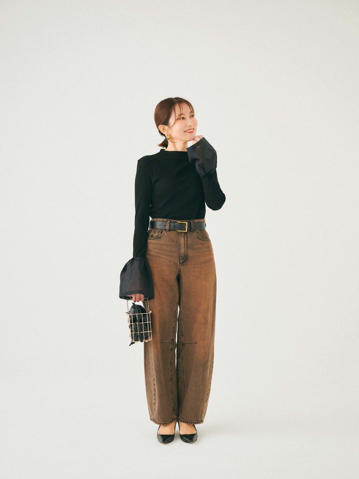 カジュアル要素が強めなウォッシュ加工のあるジーンズは、大人が穿くなら合わせるアイテムは品良くシンプルなものがベスト!袖口にだけオーガンジーの透け感のあるデザインのトップスを合わせて、女っぽいくコーディネートしました。旬なコーデが一瞬でできるバレルレッグタイプに初挑戦するなら、GUが買いです!