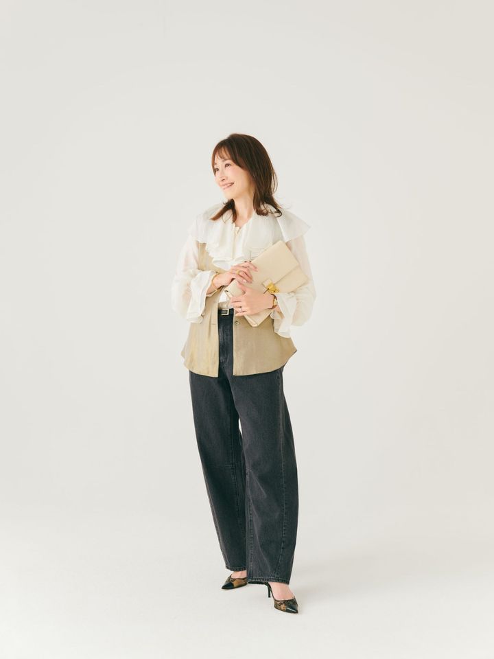 バレルレッグタイプは体型をカバーしながら、今っぽさも出せるところが好きで、よく穿いています。今回は、甘さのあるビックカラーのブラウスにジレをあわせた甘ニッシュコーデに。足元はレース感のあるヌーディーなパンプスを合わせて女っぷりを上げました。