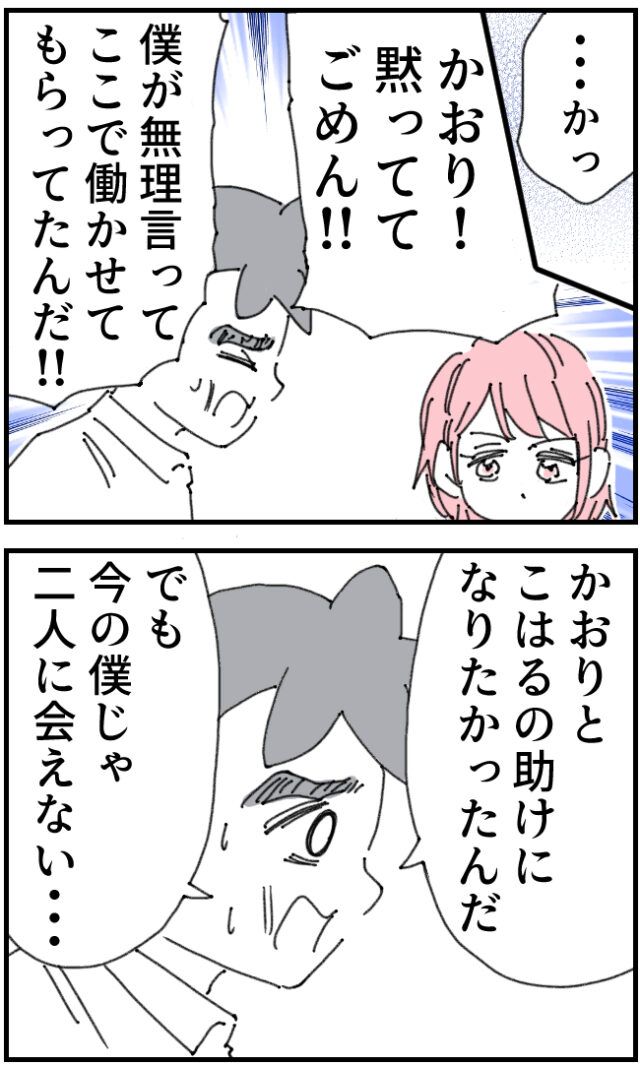 まず初めに口を開いたのはいちろうさんでした。「・・・かっかおり!黙っててごめん!!僕が無理言ってここで働かせてもらってたんだ!!」かおりさんに内緒で義両親のお店で働いていたことを謝罪し、黙っていた理由を話し始めました。「かおりとこはるの助けになりたかったんだ。でも今の僕じゃ二人に会えない・・・」