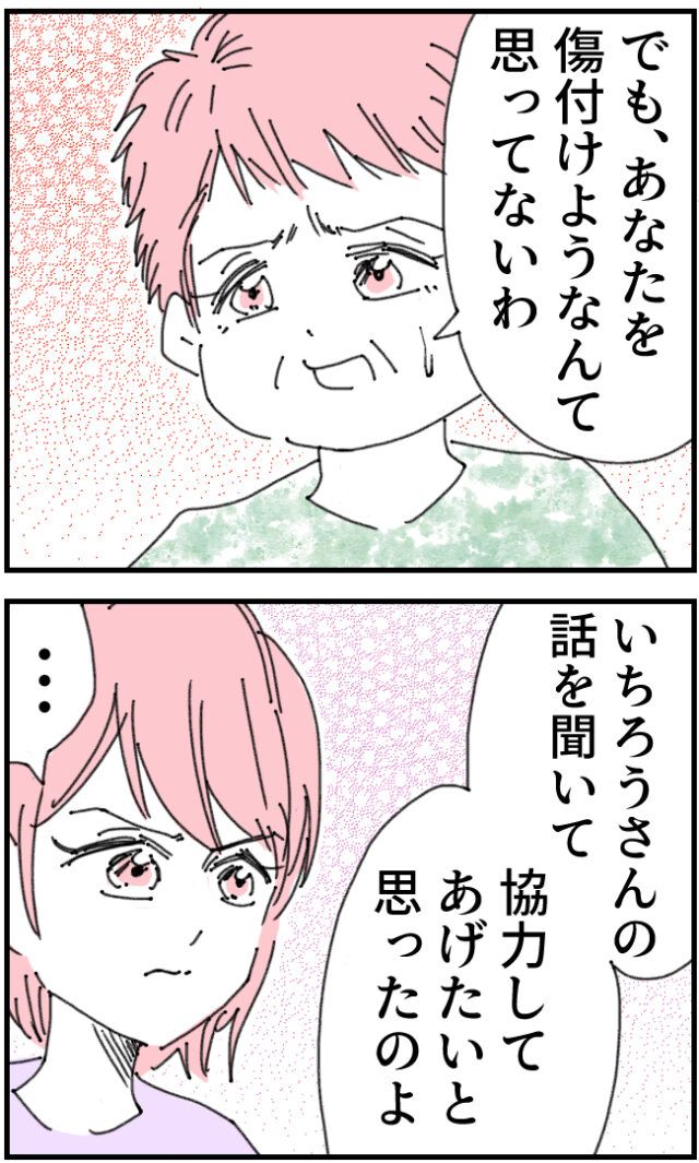 「でも、あなたを傷つけようなんて思ってないわ。いちろうさんの話を聞いて協力してあげたいと思ったのよ」かおりさんを傷つけるつもりはなかったとお母さんは申し訳なさそうに言いました。